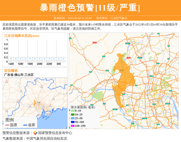 目前强雷雨云团逐渐南落,乐平累积雨量已接近50毫米,预计未来1小时降水持续,三水区气象台于2022年8月3日01时38分新增乐平暴雨橙色预警信号,区应急管理局、区气象局提醒:请注意做好防御工作。 信息来源:国家预警信息发布中心; 发布单位:三水区气象台。