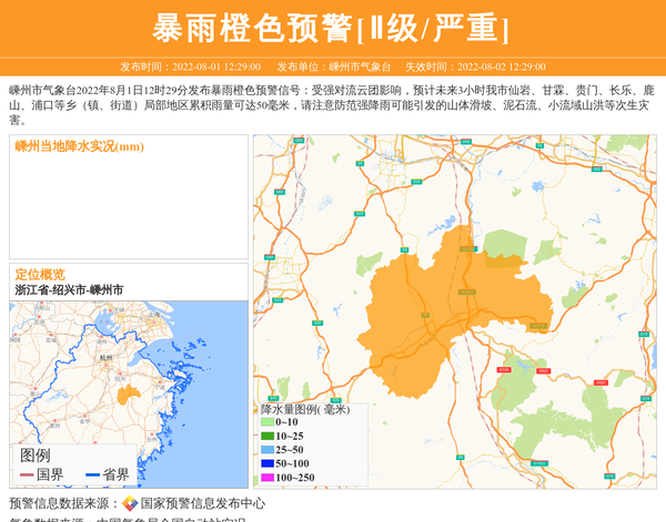 嵊州市气象台2022年8月1日12时29分发布暴雨橙色预警信号:受强对流云团影响,预计未来3小时我市仙岩、甘霖、贵门、长乐、鹿山、浦口等乡(镇、街道)局部地区累积雨量可达50毫米,请注意防范强降雨可能引发的山体滑坡、泥石流、小流域山洪等次生灾害。 信息来源:国家预警信息发布中心; 发布单位:嵊州市气象台。