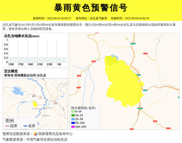 尖扎县气象台2022年8月3日03时00分发布暴雨黄色预警信号:预计3日03时00分至04时00分尖扎县马克唐镇将出现短时暴雨到大暴雨,请有关单位和人员做好防范准备。 信息来源:国家预警信息发布中心; 发布单位:尖扎县气象局。