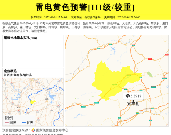 铜鼓县气象台2022年08月01日12时34分发布雷电黄色预警信号:预计未来6小时内,茶山林场、大塅镇、大沩山林场、带溪乡、港口乡、高桥乡、花山林场、龙门林场、排埠镇、棋坪镇、三都镇、温泉镇、永宁镇的部分地区有雷电活动,局地伴有短时强降水、雷暴大风等强对流天气,请注意防范。 信息来源:国家预警信息发布中心; 发布单位:铜鼓县气象局。