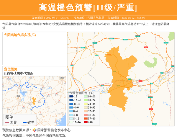 弋阳县气象台2022年08月01日12时08分变更高温橙色预警信号:预计未来24小时内,我县最高气温将达37°C以上,请注意防暑降温。 信息来源:国家预警信息发布中心; 发布单位:弋阳县气象局。