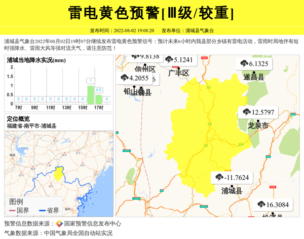 浦城县气象台2022年08月02日19时07分继续发布雷电黄色预警信号:预计未来6小时内我县部分乡镇有雷电活动,雷雨时局地伴有短时强降水、雷雨大风等强对流天气,请注意防范! 信息来源:国家预警信息发布中心; 发布单位:浦城县气象台。