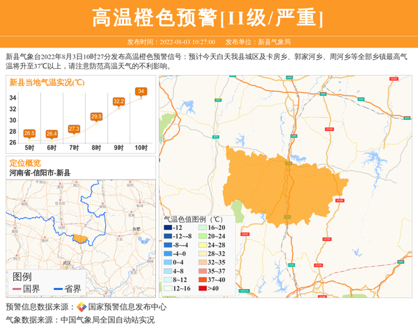 新县气象台2022年8月3日10时27分发布高温橙色预警信号:预计今天白天我县城区及卡房乡、郭家河乡、周河乡等全部乡镇最高气温将升至37℃以上,请注意防范高温天气的不利影响。 信息来源:国家预警信息发布中心; 发布单位:新县气象局。