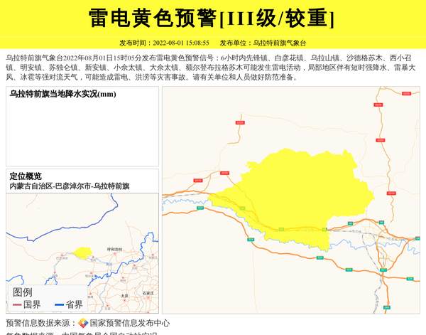 乌拉特前旗气象台2022年08月01日15时05分发布雷电黄色预警信号:6小时内先锋镇、白彦花镇、乌拉山镇、沙德格苏木、西小召镇、明安镇、苏独仑镇、新安镇、小佘太镇、大佘太镇、额尔登布拉格苏木可能发生雷电活动,局部地区伴有短时强降水、雷暴大风、冰雹等强对流天气,可能造成雷电、洪涝等灾害事故。请有关单位和人员做好防范准备。 信息来源:国家预警信息发布中心; 发布单位:乌拉特前旗气象台。