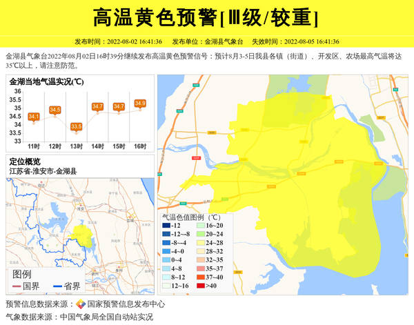 金湖县气象台2022年08月02日16时39分继续发布高温黄色预警信号:预计8月3-5日我县各镇(街道)、开发区、农场最高气温将达35℃以上,请注意防范。 信息来源:国家预警信息发布中心; 发布单位:金湖县气象台。