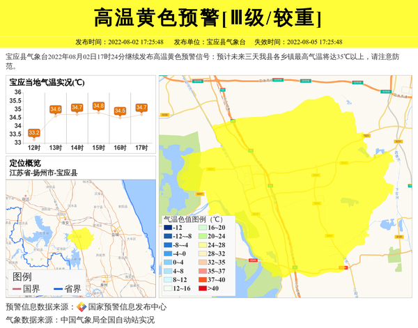 宝应县气象台2022年08月02日17时24分继续发布高温黄色预警信号:预计未来三天我县各乡镇最高气温将达35℃以上,请注意防范。 信息来源:国家预警信息发布中心; 发布单位:宝应县气象台。