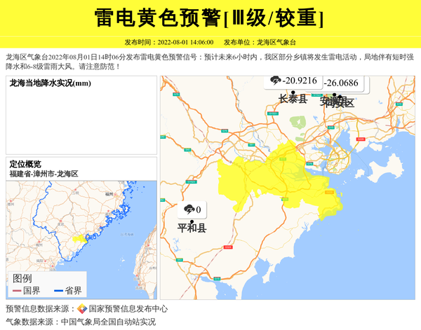 龙海区气象台2022年08月01日14时06分发布雷电黄色预警信号:预计未来6小时内,我区部分乡镇将发生雷电活动,局地伴有短时强降水和6-8级雷雨大风。请注意防范! 信息来源:国家预警信息发布中心; 发布单位:龙海区气象台。