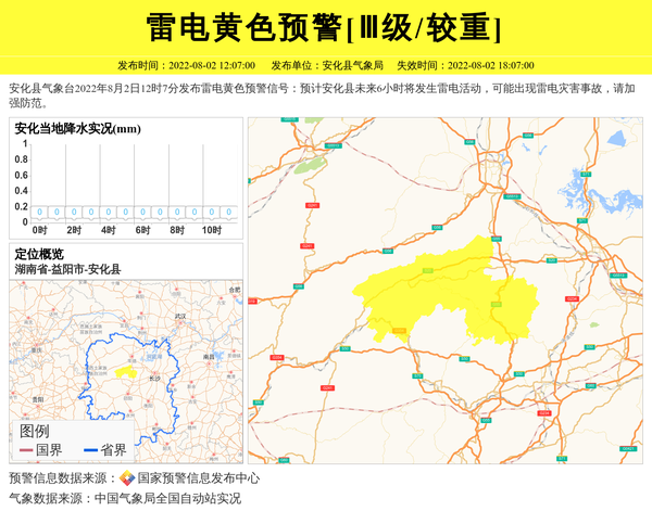 安化县气象台2022年8月2日12时7分发布雷电黄色预警信号:预计安化县未来6小时将发生雷电活动,可能出现雷电灾害事故,请加强防范。 信息来源:国家预警信息发布中心; 发布单位:安化县气象局。