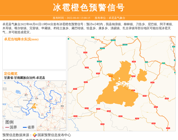 卓尼县气象台2022年08月01日13时08分发布冰雹橙色预警信号:预计6小时内,我县纳浪镇、柳林镇、刀告乡、尼巴镇、阿子滩镇、木耳镇、喀尔钦镇、完冒镇、申藏镇、杓哇土族乡、藏巴哇镇、恰盖乡、康多乡、洮砚镇、扎古录镇等部分地区可能出现冰雹天气,并可能造成雹灾。 信息来源:国家预警信息发布中心; 发布单位:卓尼县气象台。