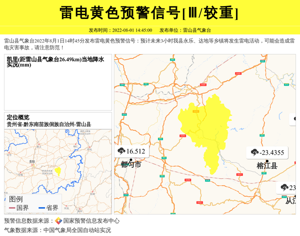 雷山县气象台2022年8月1日14时45分发布雷电黄色预警信号:预计未来3小时我县永乐、达地等乡镇将发生雷电活动,可能会造成雷电灾害事故,请注意防范! 信息来源:国家预警信息发布中心; 发布单位:雷山县气象台。