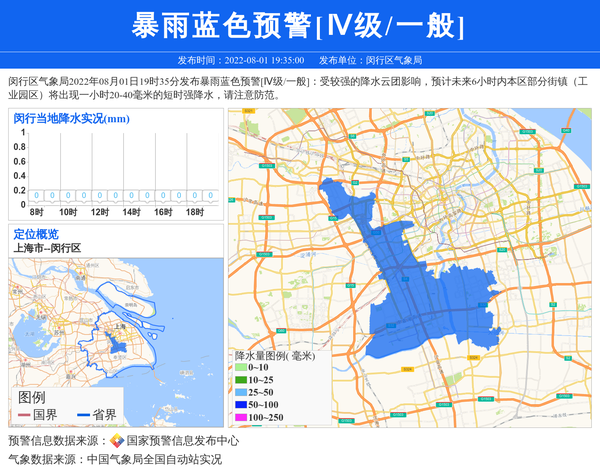 闵行区气象局2022年08月01日19时35分发布暴雨蓝色预警[Ⅳ级/一般]:受较强的降水云团影响,预计未来6小时内本区部分街镇(工业园区)将出现一小时20-40毫米的短时强降水,请注意防范。 信息来源:国家预警信息发布中心; 发布单位:闵行区气象局。