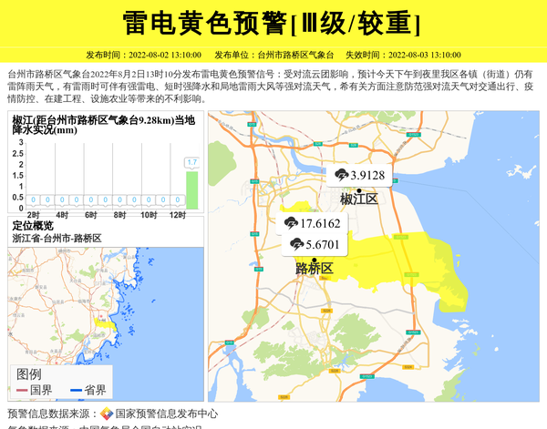 台州市路桥区气象台发布雷电黄色预警[Ⅲ级/较重] 相关文章
