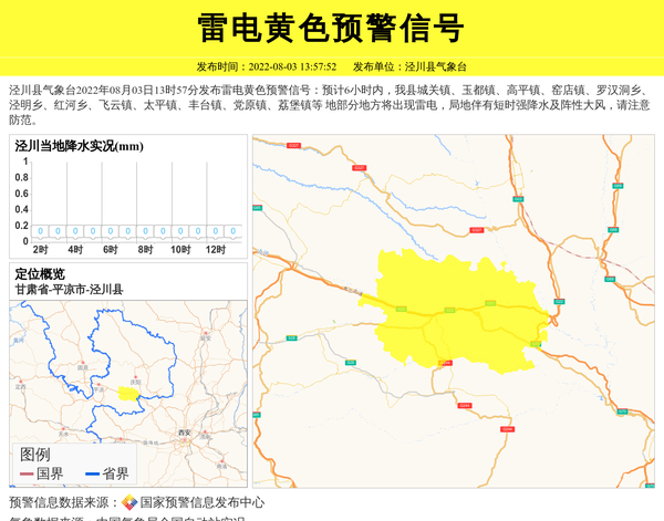泾川县气象台2022年08月03日13时57分发布雷电黄色预警信号:预计6小时内,我县城关镇、玉都镇、高平镇、窑店镇、罗汉洞乡、泾明乡、红河乡、飞云镇、太平镇、丰台镇、党原镇、荔堡镇等 地部分地方将出现雷电,局地伴有短时强降水及阵性大风,请注意防范。 信息来源:国家预警信息发布中心; 发布单位:泾川县气象台。