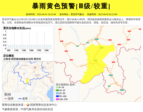 景洪市气象台2022年8月1日20时23分发布暴雨黄色预警信号:预计未来6小时内,我市勐龙镇降雨量将达50毫米以上,降雨时伴有雷电、大风、冰雹和短时强降水等局地强对流天气,请注意防范强降雨可能引发的洪涝、滑坡、泥石流、城市内涝等灾害。 信息来源:国家预警信息发布中心; 发布单位:景洪市气象台。