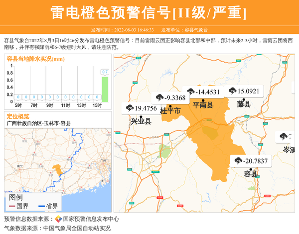 容县气象台2022年8月3日16时46分发布雷电橙色预警信号:目前雷雨云团正影响容县北部和中部,预计未来2-3小时,雷雨云团将西南移,并伴有强降雨和6-7级短时大风,请注意防范。 信息来源:国家预警信息发布中心; 发布单位:容县气象台。