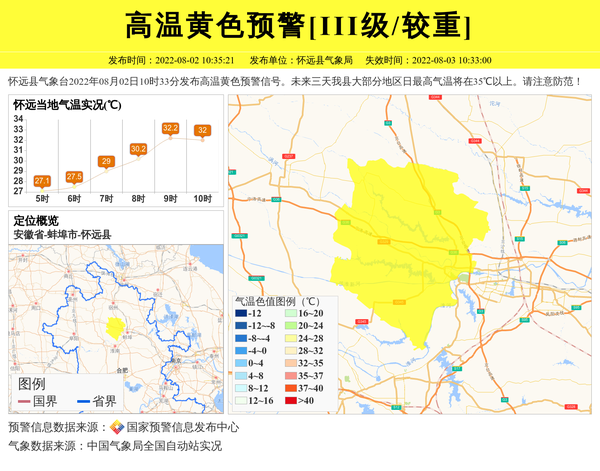 怀远县气象台2022年08月02日10时33分发布高温黄色预警信号。未来三天我县大部分地区日最高气温将在35℃以上。请注意防范! 信息来源:国家预警信息发布中心; 发布单位:怀远县气象局。