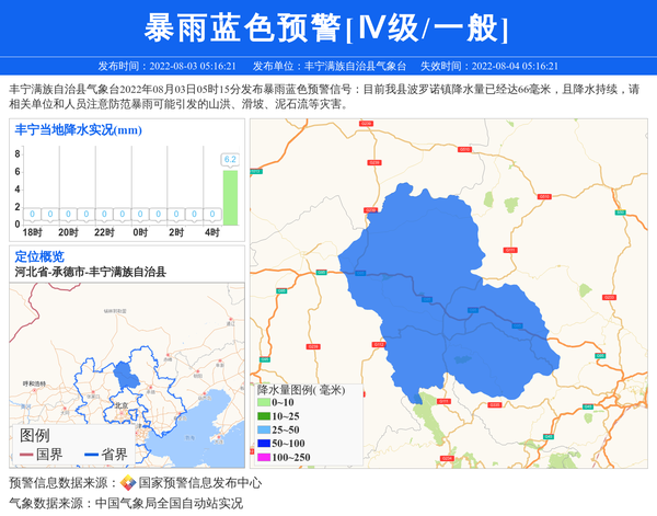 丰宁满族自治县气象台2022年08月03日05时15分发布暴雨蓝色预警信号:目前我县波罗诺镇降水量已经达66毫米,且降水持续,请相关单位和人员注意防范暴雨可能引发的山洪、滑坡、泥石流等灾害。 信息来源:国家预警信息发布中心; 发布单位:丰宁满族自治县气象台。