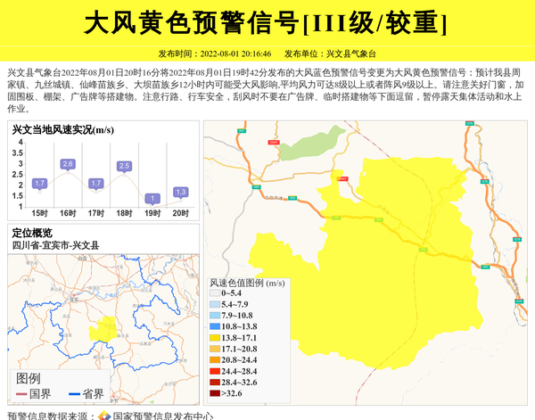 兴文县气象台2022年08月01日20时16分将2022年08月01日19时42分发布的大风蓝色预警信号变更为大风黄色预警信号:预计我县周家镇、九丝城镇、仙峰苗族乡、大坝苗族乡12小时内可能受大风影响,平均风力可达8级以上或者阵风9级以上。请注意关好门窗,加固围板、棚架、广告牌等搭建物。注意行路、行车安全,刮风时不要在广告牌、临时搭建物等下面逗留,暂停露天集体活动和水上作业。 信息来源:国家预警信息发布中心; 发布单位:兴文县气象台。