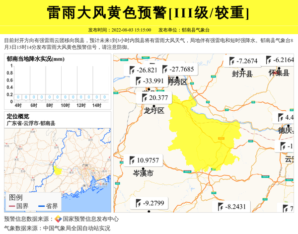 目前封开方向有强雷雨云团移向我县,预计未来1到3小时内我县将有雷雨大风天气,局地伴有强雷电和短时强降水。郁南县气象台8月3日15时14分发布雷雨大风黄色预警信号,请注意防御。 信息来源:国家预警信息发布中心; 发布单位:郁南县气象台。