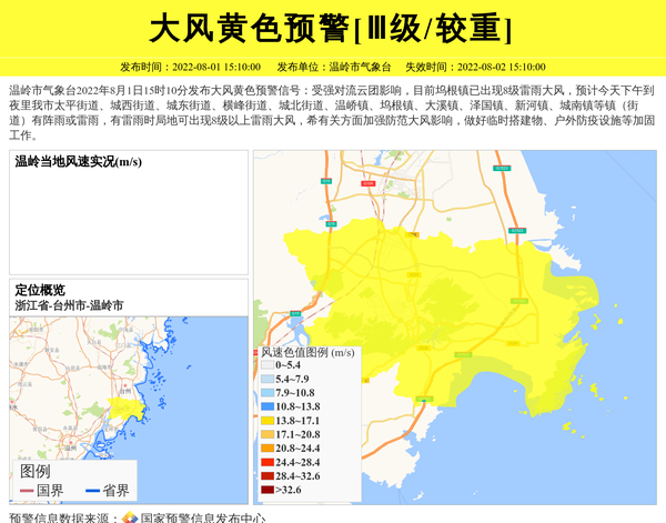 温岭市气象台2022年8月1日15时10分发布大风黄色预警信号:受强对流云团影响,目前坞根镇已出现8级雷雨大风,预计今天下午到夜里我市太平街道、城西街道、城东街道、横峰街道、城北街道、温峤镇、坞根镇、大溪镇、泽国镇、新河镇、城南镇等镇(街道)有阵雨或雷雨,有雷雨时局地可出现8级以上雷雨大风,希有关方面加强防范大风影响,做好临时搭建物、户外防疫设施等加固工作。 信息来源:国家预警信息发布中心; 发布单位:温岭市气象台。