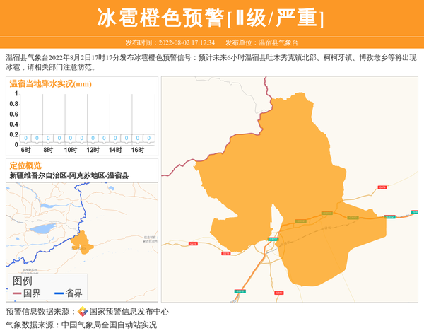 温宿县气象台2022年8月2日17时17分发布冰雹橙色预警信号:预计未来6小时温宿县吐木秀克镇北部、柯柯牙镇、博孜墩乡等将出现冰雹,请相关部门注意防范。 信息来源:国家预警信息发布中心; 发布单位:温宿县气象台。