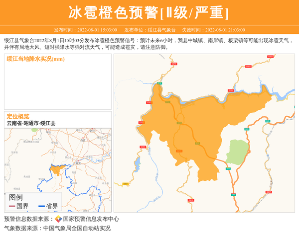 绥江县气象台2022年8月1日15时03分发布冰雹橙色预警信号:预计未来6小时,我县中城镇、南岸镇、板栗镇等可能出现冰雹天气,并伴有局地大风、短时强降水等强对流天气,可能造成雹灾,请注意防御。 信息来源:国家预警信息发布中心; 发布单位:绥江县气象台。