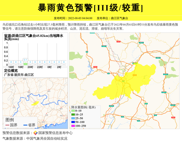 乌石镇坑口石角站过去1小时出现27.5毫米降雨,预计降雨持续,曲江区气象台已于2022年08月03日03时53分发布乌石镇暴雨黄色预警信号,请注意防御强降雨及其引发的城乡积涝、山洪、泥石流、滑坡、崩塌等次生灾害。 信息来源:国家预警信息发布中心; 发布单位:曲江区气象台。
