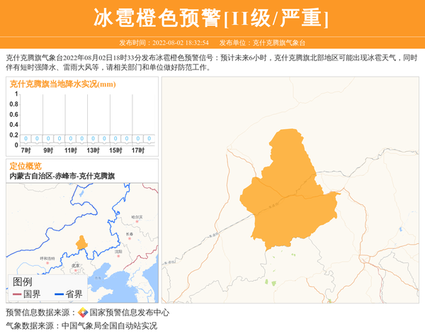克什克腾旗气象台2022年08月02日18时33分发布冰雹橙色预警信号:预计未来6小时,克什克腾旗北部地区可能出现冰雹天气,同时伴有短时强降水、雷雨大风等,请相关部门和单位做好防范工作。 信息来源:国家预警信息发布中心; 发布单位:克什克腾旗气象台。