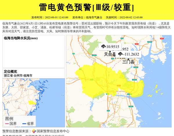 临海市气象台2022年8月1日12时45分发布雷电黄色预警信号:受对流云团影响,预计今天下午到夜里我市所有镇(街道),尤其是东塍、大田、邵家渡、小芝、涌泉、杜桥等镇(街道)将有雷雨天气,有雷雨时可伴有分散性雷电、短时强降水和局地7-9级阵性大风等对流天气,请注意防范雷电、大风、短时降雨等带来的不利影响。 信息来源:国家预警信息发布中心; 发布单位:临海市气象台。