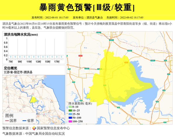 泗洪县气象台2022年08月01日18时15分发布暴雨黄色预警信号:预计今天傍晚到夜里我县中部青阳街道等乡(镇、街道)将出现6小时50毫米以上的暴雨,县应急、气象联合提醒做好防范。 信息来源:国家预警信息发布中心; 发布单位:泗洪县气象台。