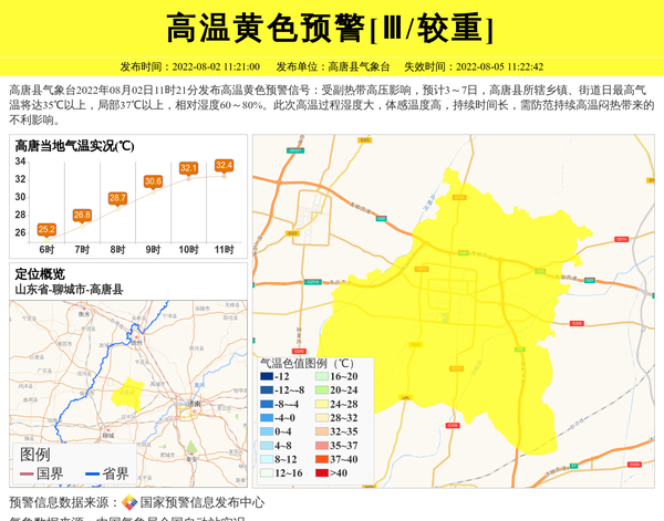高唐县气象台2022年08月02日11时21分发布高温黄色预警信号:受副热带高压影响,预计3~7日,高唐县所辖乡镇、街道日最高气温将达35℃以上,局部37℃以上,相对湿度60~80%。此次高温过程湿度大,体感温度高,持续时间长,需防范持续高温闷热带来的不利影响。 信息来源:国家预警信息发布中心; 发布单位:高唐县气象台。