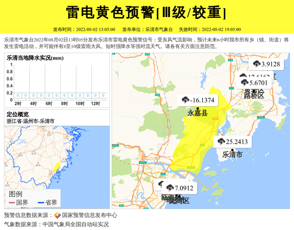 乐清市气象台2022年08月02日13时05分发布乐清市雷电黄色预警信号:受东风气流影响,预计未来6小时我市所有乡(镇、街道)将发生雷电活动,并可能伴有8至10级雷雨大风、短时强降水等强对流天气。请各有关方面注意防范。 信息来源:国家预警信息发布中心; 发布单位:乐清市气象台。