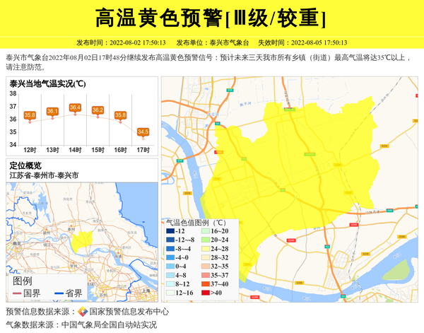 泰兴市气象台2022年08月02日17时48分继续发布高温黄色预警信号:预计未来三天我市所有乡镇(街道)最高气温将达35℃以上,请注意防范。 信息来源:国家预警信息发布中心; 发布单位:泰兴市气象台。