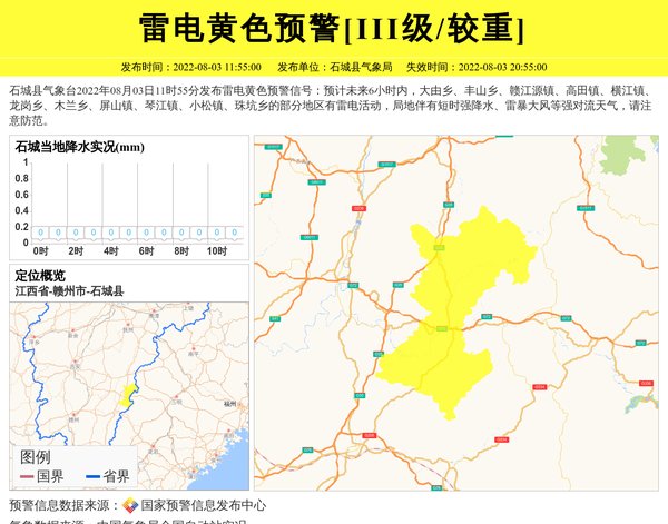 石城县气象台2022年08月03日11时55分发布雷电黄色预警信号:预计未来6小时内,大由乡、丰山乡、赣江源镇、高田镇、横江镇、龙岗乡、木兰乡、屏山镇、琴江镇、小松镇、珠坑乡的部分地区有雷电活动,局地伴有短时强降水、雷暴大风等强对流天气,请注意防范。 信息来源:国家预警信息发布中心; 发布单位:石城县气象局。