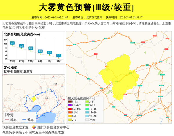 大雾黄色预警信号:预计未来1到2小时,北票市将出现能见度小于500米的大雾天气,并将持续3到4小时,请注意交通安全。北票市气象台2022年8月3日2时49分发布 信息来源:国家预警信息发布中心; 发布单位:北票市气象局。