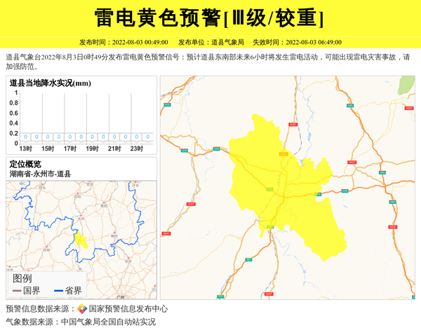道县气象台2022年8月3日0时49分发布雷电黄色预警信号:预计道县东南部未来6小时将发生雷电活动,可能出现雷电灾害事故,请加强防范。 信息来源:国家预警信息发布中心; 发布单位:道县气象局。