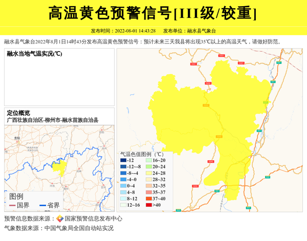 融水县气象台2022年8月1日14时43分发布高温黄色预警信号:预计未来三天我县将出现35℃以上的高温天气,请做好防范。 信息来源:国家预警信息发布中心; 发布单位:融水县气象台。