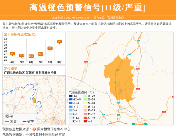 富川县气象台2日9时42分继续发布高温橙色预警信号。预计未来24小时富川县仍将出现37度以上的高温天气,请注意做好防暑降温措施,并注意防范中小学生溺水事件发生。 信息来源:国家预警信息发布中心; 发布单位:富川县气象台。