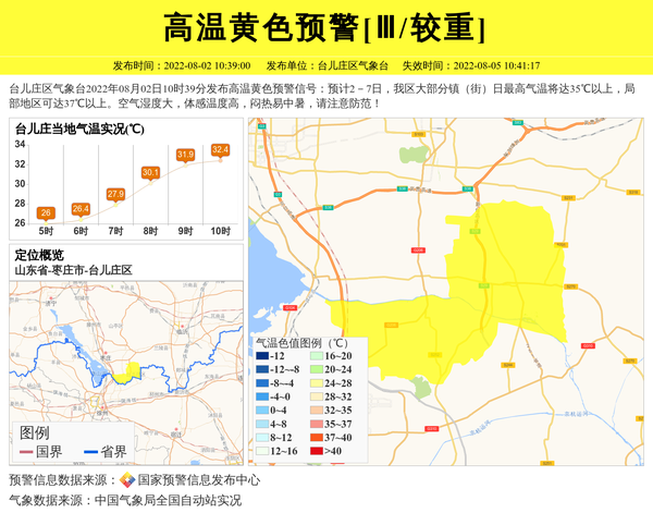 台儿庄区气象台2022年08月02日10时39分发布高温黄色预警信号:预计2-7日,我区大部分镇(街)日最高气温将达35℃以上,局部地区可达37℃以上。空气湿度大,体感温度高,闷热易中暑,请注意防范! 信息来源:国家预警信息发布中心; 发布单位:台儿庄区气象台。