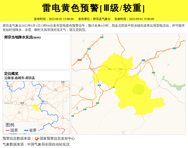 师宗县气象台2022年8月1日13时00分发布雷电黄色预警信号:预计未来6小时,我县北部及中部乡镇街道将出现雷电活动,并可能伴有短时强降水、冰雹、瞬时大风等强对流天气,请注意防范。 信息来源:国家预警信息发布中心; 发布单位:师宗县气象台。