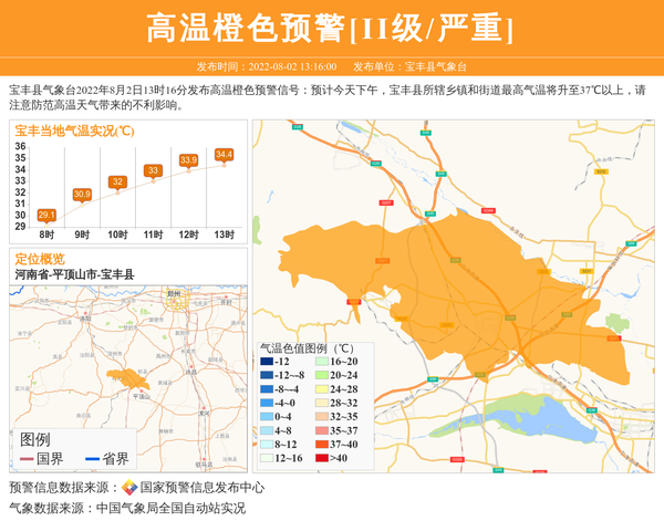 宝丰县气象台2022年8月2日13时16分发布高温橙色预警信号:预计今天下午,宝丰县所辖乡镇和街道最高气温将升至37℃以上,请注意防范高温天气带来的不利影响。 信息来源:国家预警信息发布中心; 发布单位:宝丰县气象台。