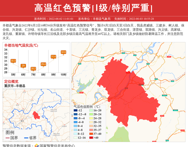 丰都县气象台2022年8月2日10时50分升级发布“高温红色预警信号”,预计8月2日白天至3日白天,我县虎威镇、三建乡、树人镇、保合镇、兴龙镇、仁沙镇、社坛镇、名山街道、十直镇、三元镇、青龙乡、双龙镇、三合街道、湛普镇、双路镇、兴义镇、高家镇、龙孔镇、董家镇、许明寺镇等长江沿线及北部乡镇日最高气温将升至40℃以上。请相关部门及乡镇做好防暑降温工作,并注意防范火灾。 信息来源:国家预警信息发布中心; 发布单位:丰都县气象局。