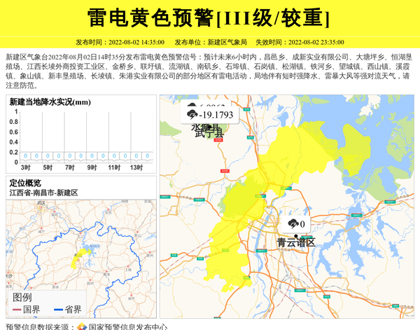 新建区气象台2022年08月02日14时35分发布雷电黄色预警信号:预计未来6小时内,昌邑乡、成新实业有限公司、大塘坪乡、恒湖垦殖场、江西长堎外商投资工业区、金桥乡、联圩镇、流湖镇、南矶乡、石埠镇、石岗镇、松湖镇、铁河乡、望城镇、西山镇、溪霞镇、象山镇、新丰垦殖场、长堎镇、朱港实业有限公司的部分地区有雷电活动,局地伴有短时强降水、雷暴大风等强对流天气,请注意防范。 信息来源:国家预警信息发布中心; 发布单位:新建区气象局。
