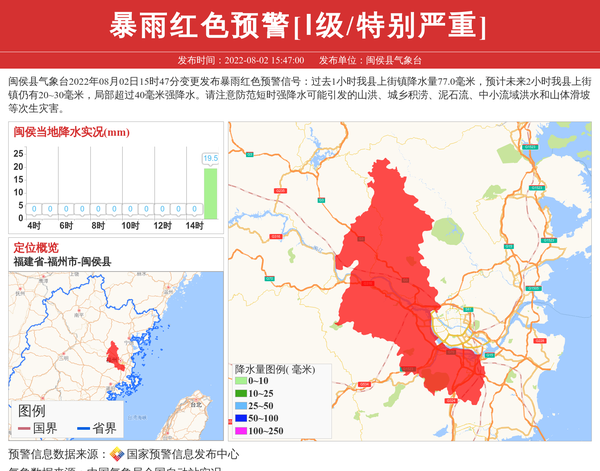 闽侯县气象台2022年08月02日15时47分变更发布暴雨红色预警信号:过去1小时我县上街镇降水量77.0毫米,预计未来2小时我县上街镇仍有20~30毫米,局部超过40毫米强降水。请注意防范短时强降水可能引发的山洪、城乡积涝、泥石流、中小流域洪水和山体滑坡等次生灾害。 信息来源:国家预警信息发布中心; 发布单位:闽侯县气象台。