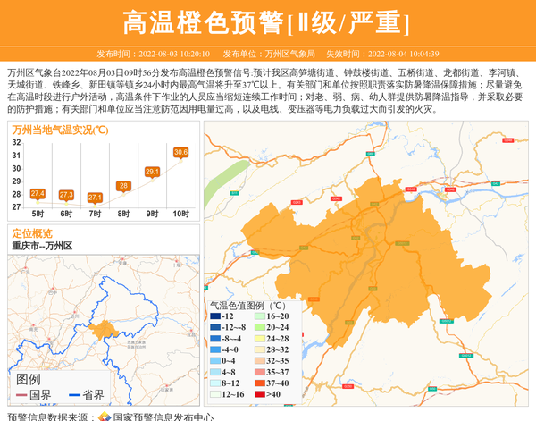 万州区气象台2022年08月03日09时56分发布高温橙色预警信号:预计我区高笋塘街道、钟鼓楼街道、五桥街道、龙都街道、李河镇、天城街道、铁峰乡、新田镇等镇乡24小时内最高气温将升至37℃以上。有关部门和单位按照职责落实防暑降温保障措施;尽量避免在高温时段进行户外活动,高温条件下作业的人员应当缩短连续工作时间;对老、弱、病、幼人群提供防暑降温指导,并采取必要的防护措施;有关部门和单位应当注意防范因用电量过高,以及电线、变压器等电力负载过大而引发的火灾。 信息来源:国家预警信息发布中心; 发布单位:万州区气象局。