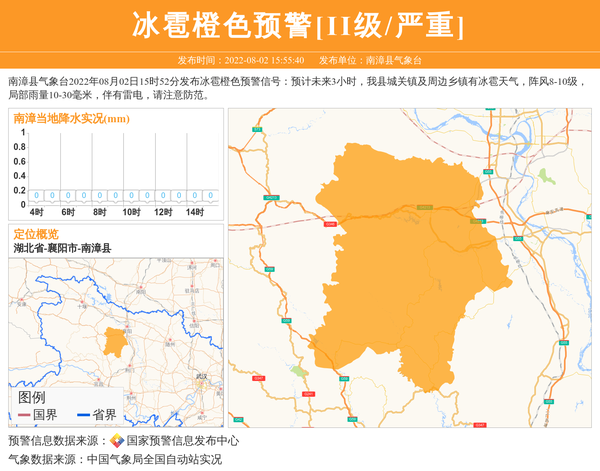 南漳县气象台2022年08月02日15时52分发布冰雹橙色预警信号:预计未来3小时,我县城关镇及周边乡镇有冰雹天气,阵风8-10级,局部雨量10-30毫米,伴有雷电,请注意防范。 信息来源:国家预警信息发布中心; 发布单位:南漳县气象台。