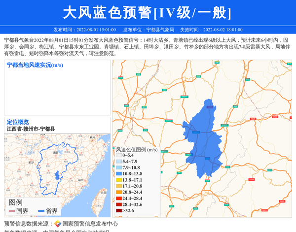 宁都县气象台2022年08月01日15时01分发布大风蓝色预警信号:14时大沽乡、青塘镇已经出现6级以上大风,预计未来6小时内,固厚乡、会同乡、梅江镇、宁都县水东工业园、青塘镇、石上镇、田埠乡、湛田乡、竹笮乡的部分地方将出现7-8级雷暴大风,局地伴有强雷电、短时强降水等强对流天气,请注意防范。 信息来源:国家预警信息发布中心; 发布单位:宁都县气象局。