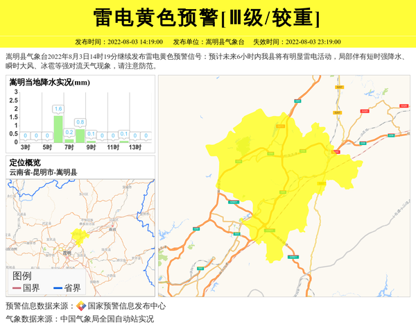 嵩明县气象台2022年8月3日14时19分继续发布雷电黄色预警信号:预计未来6小时内我县将有明显雷电活动,局部伴有短时强降水、瞬时大风、冰雹等强对流天气现象,请注意防范。 信息来源:国家预警信息发布中心; 发布单位:嵩明县气象台。
