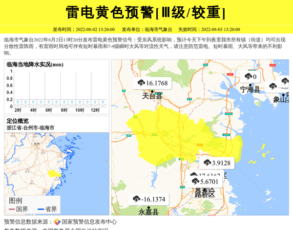 临海市气象台2022年8月2日13时20分发布雷电黄色预警信号:受东风系统影响,预计今天下午到夜里我市所有镇(街道)均可出现分散性雷阵雨,有雷雨时局地可伴有短时暴雨和7-9级瞬时大风等对流性天气,请注意防范雷电、短时暴雨、大风等带来的不利影响。 信息来源:国家预警信息发布中心; 发布单位:临海市气象台。