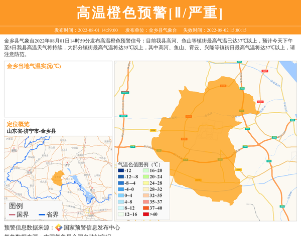 金乡县气象台2022年08月01日14时59分发布高温橙色预警信号:目前我县高河、鱼山等镇街最高气温已达37℃以上,预计今天下午至5日我县高温天气将持续,大部分镇街最高气温将达35℃以上,其中高河、鱼山、霄云、兴隆等镇街日最高气温将达37℃以上,请注意防范。 信息来源:国家预警信息发布中心; 发布单位:金乡县气象台。